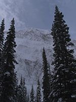 Landschapsopname van de machtige besneeuwde oostwand van Mount Edith Cavell in Jasper National Park, Alberta, Canada in de Rocky Mountains in de vroege winter met coniferen op de voorgrond.