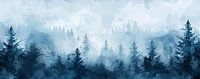 Dit aquarelkunstwerk brengt een betoverend boslandschap tot leven, volledig gehuld in zachte blauwtinten en omgeven door een dikke laag mist.