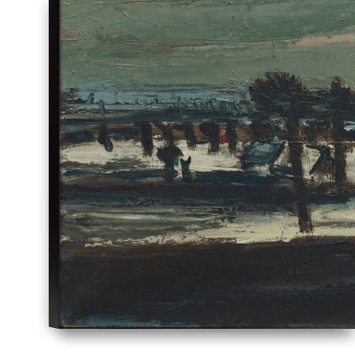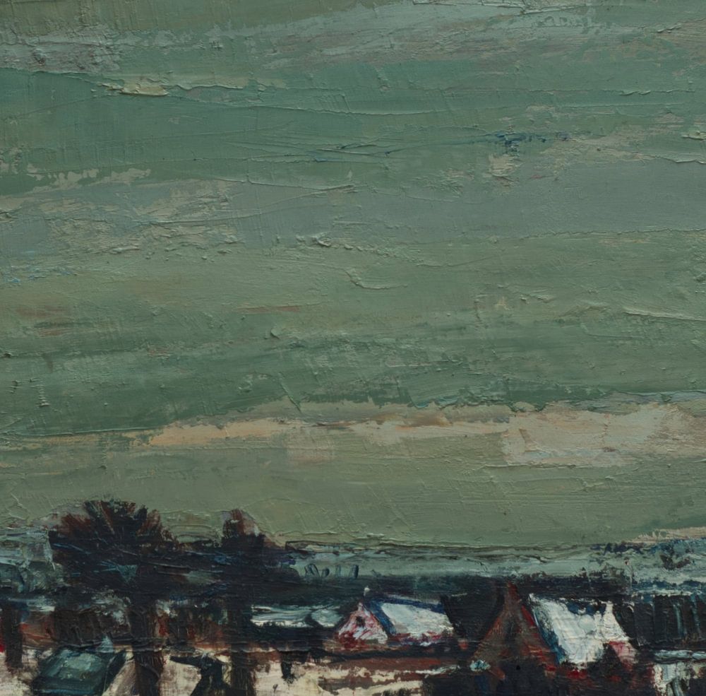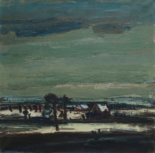 In dit winterlandschap zie je een klein dorp met besneeuwde daken, donkere bomen en een zachte, groenblauwe lucht die als een stille deken over het geheel hangt. De voorgrond is donker en ruig, met plekken sneeuw die het licht subtiel opvangen, terwijl de huizen in de verte warm en herkenbaar blijven.