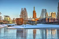 Een winters beeld uit het Museumpark in Rotterdam. er ligt ijs op de vijver en sneeuw in de tuin van museum Boymans van Beuningen. Links op de achtergrond zien we het Nieuwe Instituut (voorheen het NAI), rechts op de achtergrond is onder andere het Parkhotel te zien.