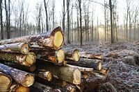 Gekapte bomen in een winters mistig bos