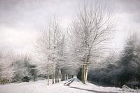 Paadje tussen de berken in besneeuwd landschap. Diemer bos. Nederland