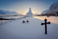 Een prachtig kerkje midden in de sneeuw tijdens zonsopkomst op de Lofoten. De kruizen vormen een mooie betekenisvolle voorgrond. Het licht was geweldig deze ochtend en ik kon de zon precies achter de kerk plaatsen.