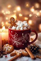 Een rode mok, versierd met fijne sneeuwvlokjes, rust in het midden van een feestelijke droom van lichtjes. Een knapperig peperkoekmannetje troont boven de dampende chocolade, terwijl pluizige marshmallows de bovenkant bekronen als kleine wolkjes. Kaneelstokjes en zoete koekjes verspreiden een verleidelijk aroma dat het koude seizoen…