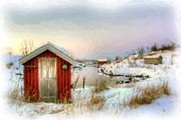 Aquarel schilderij winter landschap Noorwegen met rode huisjes aan meer