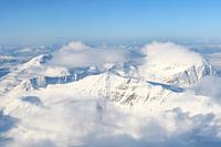 Luchtfoto van een vliegtuig dat hoog over de besneeuwde bergen in Noord-Noorwegen vliegt tijdens een mooie winterdag.