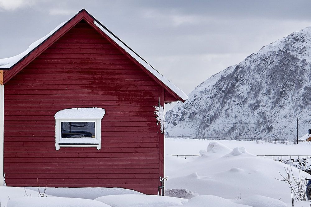 Trollstigen in een winters landschap, Noorwegenqtx Winter landschap met kleurige hutten en berg op Godøy, Ålesund, Noorwegenqtx