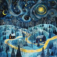 Een winterse nacht en een wervelende sterrenhemel vol licht en beweging. Het kronkelende pad, verlicht door een zachte gouden gloed, leidt naar huisjes die warmte en geborgenheid uitstralen, terwijl het landschap wordt omringd door majestueuze bomen en winterse stilte.