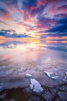 Winter landschap op het IJsselmeer bij Workum in Friesland met een kleurrijke zonsondergang. Wolken drijven voorbij tijdens de zonsondergang en zorgen voor een winterse sfeer.