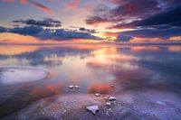 Winter landschap op het IJsselmeer bij Workum in Friesland met een kleurrijke zonsondergang. Wolken drijven voorbij tijdens de zonsondergang en zorgen voor een winterse sfeer.