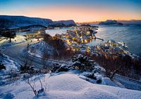 Winter landschap over Ålesund vanaf Fjellstua tijdens zonsondergang, Noorwegen