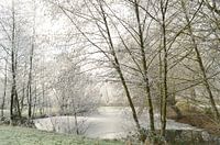 Foto gemaakt in een park na een zeer koude januari nacht, hier in Zuid West Frankrijk. Alles was bedekt met witte mesjes. De vijver was bevroren alleen rechts voor is nog een stuk open water.