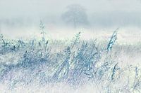 Een artistiek werk van een winterlandschap in de mist. Het is een fotobewerking met grassen op de voorgrond in de vage silhouetten van een kale eik in de verte.