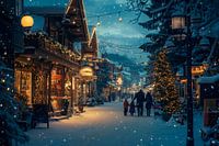 Een feestelijk versierde straat schittert in een magisch winterlandschap, gehuld in zachte sneeuwvlokken. Lichtjes fonkelen op de huizen en een kerstboom wordt omringd door vrolijke mensen. Dit sfeervolle tafereel brengt warmte in elke woonkamer en nodigt uit tot dromen. Perfect voor gezellige avonden in het koude seizoen.