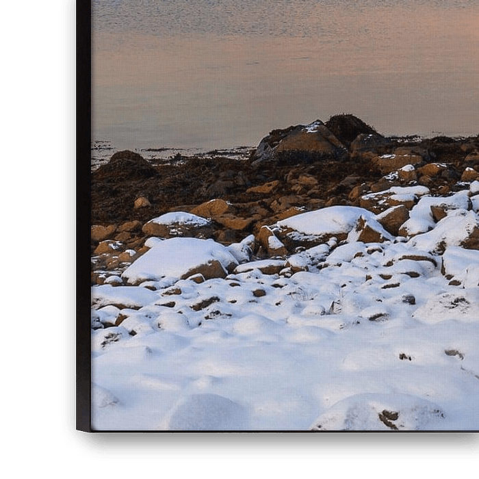Deze foto is genomen in noord Noorwegen op 69° noorderbreedte. De rode huisjes liggen aan de Grøtfjord (provincie Troms). Het is hartje winter en de lage zon geeft een gouden gloed op de bergen en de zee, en brengt mooie kleuren in de lucht.
