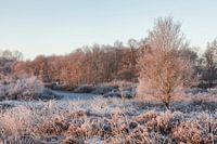 Als de mist is opgetrokken op een koude wintermorgen, komen de heide, de grassen en de berken mooi wit tevoorschijn. Voorzichtig begint de zon er op te schijnen.