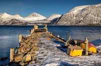 Kvaløy is een eiland in de buurt van de stad Tromsø in Noord Noorwegen. Hier zien we de kust op een heldere winterdag met een aanlegsteiger en gele bootjes.