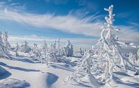 Winter op de berg Brocken in Duitsland met zware sneeuw bedekte sparren in de zon.