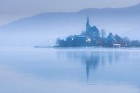 Winter op de Ossiacher See in Oostenrijk op een koele januari ochtend. Koude mist hangt over het meer met de bergen in de achtergrond. De kerk en huizen weerspiegelen in het water van het meer.