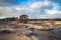 Winter in de vroege ochtend bij het bosmeertje op Landgoed Heidestein Bornia in Driebergen Zeist op de Utrechtse Heuvelrug. Een laagje rijp ligt over het landgoed met een gouden zonnetje.