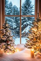 Een zacht licht stroomt door het ijzige raam en omhult de besneeuwde dennenbomen buiten. Binnen fonkelen de liefdevol versierde kerstbomen, terwijl de kaarsen een warme, uitnodigende gloed verspreiden. De harmonieuze combinatie van winterse kilte en feestelijke gezelligheid creëert een magische anticipatie op de feestdagen.