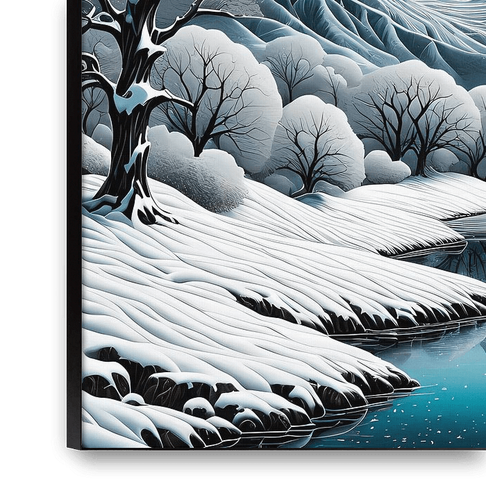 Dit digitale kunstwerk verbeeldt een sereen en magisch winterlandschap. Een besneeuwde vallei is genesteld tussen torenhoge, gestileerde bergen met scherpe, gekartelde pieken. Een kalme, reflecterende rivier meandert door de vallei en weerspiegelt de levendige blauwe lucht en de zachte gloed van een volle maan. De bomen op de voorgrond…