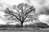 Zo'n foto van een silhouet heeft geen enkele kleur nodig. Daarom heb ik de foto omgezet naar zwart wit. Dit benadrukt nog meer de mooie vorm van de imposante eikenboom. De bijzondere wolken in de achtergrond geven de foto een dramatische uitstraling en zwart wit benadrukt deze sfeer nog meer.