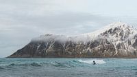 Surfen in winterse omstandigheden op de Lofoten in Noorwegen. Met de sneeuw op de achtergrond is het een surrealistisch plaatje.