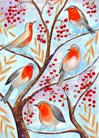 Een schattige illustratie met winter vogels. Roodborstjes in de winter met kerst. In een besneeuwde boom eten ze rode besjes. Origineel acrylverf, potlood, crayon op papier.