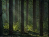 Midden in het donkere bos op een koude winter dag, komt de ondergaande zon tevoorschijn om de jonge dennenboompjes in een warm winter licht te zetten. Nationaal park Utrechtse Heuvelrug.