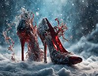 Een glazen schoen in de sneeuw, gevuld met gemorste wijn. Een foto vol plezier en winterse magie.
