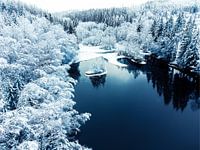 Het begin van de winter! Besneeuwde bomen omringen het meer in het bos.