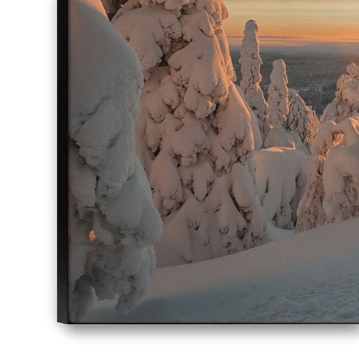 Zonnestralen tussen de besneeuwde bomen door in Fins lapland