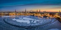 Winter zonsondergang skyline van Hamburg, Duitsland met bevroren Binnenalster meer