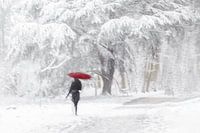 deze dame wandelde tijdens een winterse sneeuwbui in het Rivierenhof te Antwerpen, dit is een prachtige locatie in alle seizoenen. Deze dame had een rode regenscherm bij wat zeer leuk is om een foto van te maken.