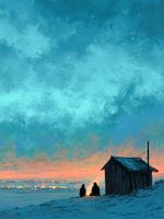 Deze kunstprint toont een klein huis in een uitgestrekt landschap, met twee figuren bij een…