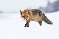 Een vos in een besneeuwd duinlandschap