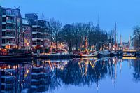 Tijdens WinterWelvaart zijn verschillen schepen op diverse plaatsen in de stad Groningen verlicht. De foto is gemaakt tijdens het blauwe kwartiertje (net na zonsondergang) vanaf de Eelderbrug richting de Zuiderhaven.