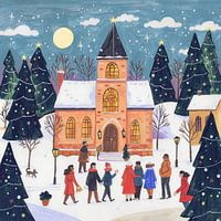 Een sfeervol wintertafereel vol warmte en samenzijn. Onder een fonkelende sterrenhemel wandelen mensen richting de verlichte kerk, omringd door met lichtjes versierde dennenbomen. De sneeuw glinstert in het maanlicht en de avond ademt rust, gezelligheid en feestvreugde.