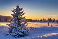 De zon gaat onder over een Noors winter landschap. We zien een weiland met naaldbomen en met veel sneeuw.