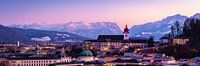 Gezicht op het benedictijnenklooster Stift Nonnberg met de stiftskerk en de Alpen bij schemering