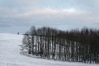 Zicht op een heuvellandschap in de winter, dun sneeuwdek op een akker, een grote groep bomen rechts, bewolkte hemel, enige wolkenverkleuring door de zonsondergang - Plaats: Duitsland, Saksen, Osterzgebirge, Breitenau, Bad Gottleuba-Berggießhübel