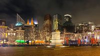 Avondopname van het Plein in het centrum van Den Haag met het standbeeld van Willem van Oranje en de karakteristieke hoogbouw in de achtergrond. De bomen zijn uitgerust met feestverlichting. Deze foto is gemaakt in Januari 2018