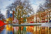Een winters beeld van de Westersingel en de Mauritsweg in het centrum van Rotterdam. De nieuwbouw van Calypso, de vooroorlogse panden en de beroemde plataan weerspiegelen in het spiegelgladde ijs op de singel.
