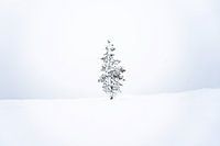 De winterse taiga gefotografeerd in Fins Lapland. Een breedhoekfoto van een besneeuwde boom in de monotone kleuren van sneeuw en boom.