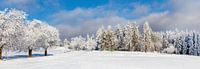 Deze landschapsfoto toont een weidse panoramafoto van een winters bos in Thüringen. Links staan enkele besneeuwde fruitbomen waarvan de takken zachtjes naar beneden hangen onder het gewicht van de verse sneeuw. Achter hen strekt zich een dicht naaldbos uit, met hoge, besneeuwde sparren en sparren die als witte pilaren oprijzen. De lucht…