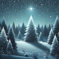 Een rustig winterlandschap met verschillende bomen in de sneeuw, hun takken bedekt met een dikke laag sneeuw.