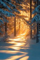In het besneeuwde bos ontvouwt zich een magisch spel van licht en schaduw. Felle zonnestralen breken door de dichte boomtoppen en doen de glinsterende sneeuw lijken op vloeibaar goud. Het spoor in de sneeuw nodigt je uit om dit magische pad te verkennen, waar elke stap klinkt als een stille belofte in de stilte van de natuur.