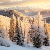Een magisch winterwonderland ontvouwt zich in zachte kleuren; de bomen glinsteren in het warme licht van de opkomende zon, terwijl de sneeuw het landschap omhult als een delicaat tapijt. Majestueuze bergen torenen trots uit op de achtergrond, hun toppen stralen goudkleurig. Vrede en poëzie smelten hier samen in de koele ochtendlucht.