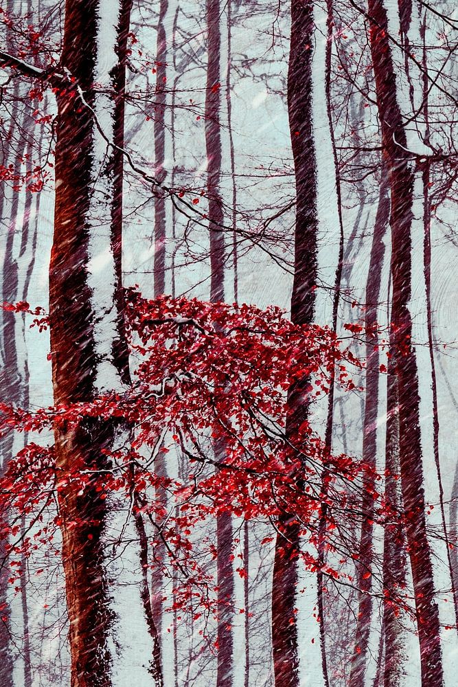 Hoge, slanke bomen torenen de lucht in in een besneeuwd boslandschap. Felrode bladeren steken af tegen de koele, mintkleurige achtergrond. Tegelijkertijd blaast de wind meer sneeuwvlokken tegen de boomstammen. Foto bewerkt met texturen.